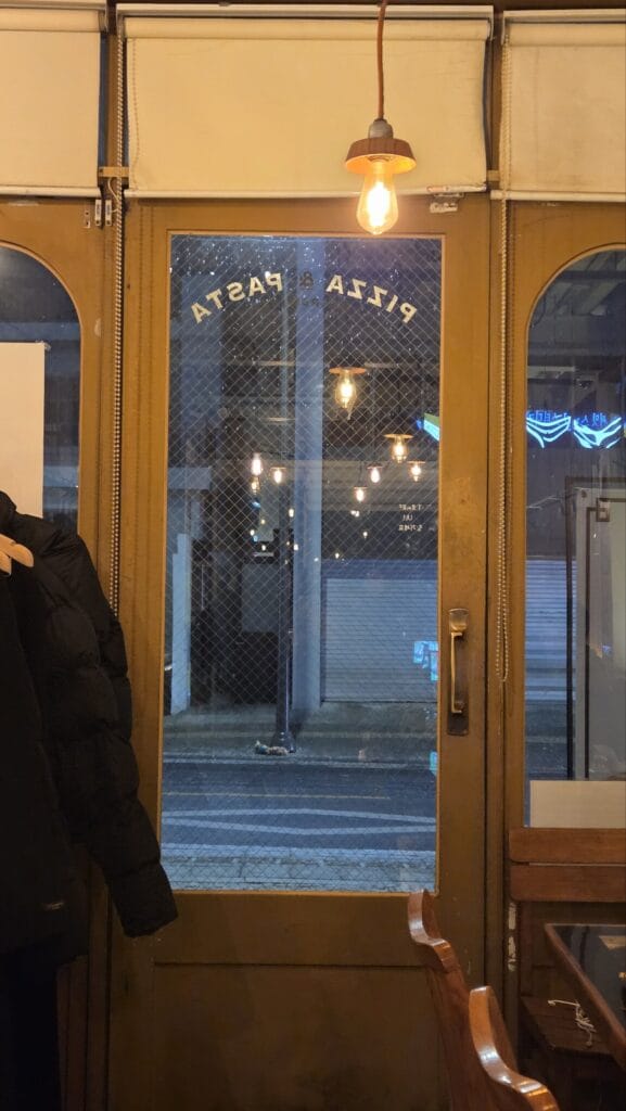 A shot looking out the glass door. The text “PIZZA & PASTA” is visible on the glass, and through the window, you can see the cold, blue-toned street outside, contrasting with the warm amber light inside